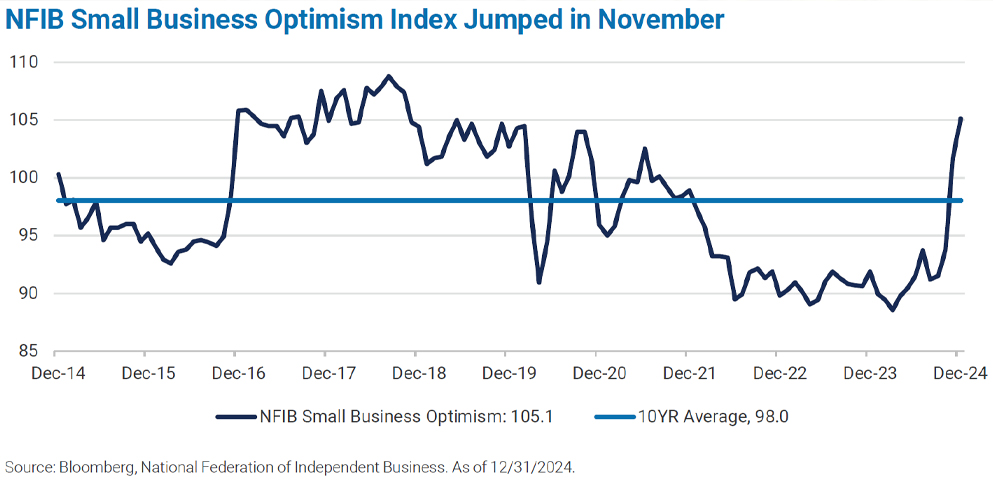 Main Street sentiment notably improved post-election too. The NFIB Small Business Optimism Index jumped in November to its highest reading since June 2021 and continued to climb in December. Consumer confidence also rose precipitously, exemplified by spikes in the University of Michigan Consumer Sentiment and Conference Board Consumer Confidence indices following the election results.